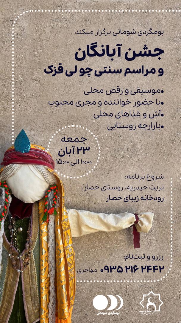 پایگاه خبری نوید تربت: http://www.navidtorbat.irنوید تربت- به همت مجموعه بومگردی شومانی، برای دومین سال، جشن باستانی آبانگان همراه با مراسم سنتی چولقزک برای طلب باران در روستای زیبای ییلاقی حصار تربت حیدریه برگزار می شود.